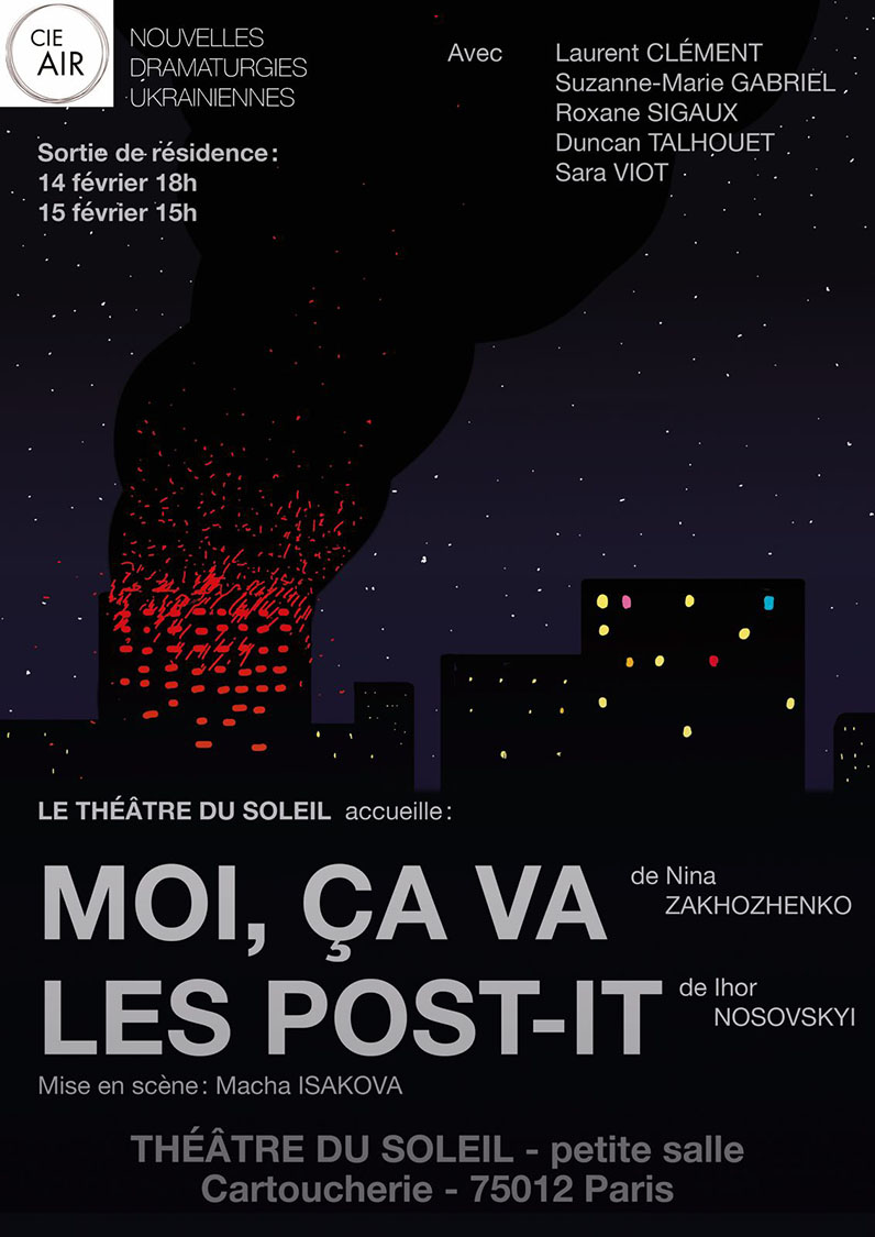 par la Compagnie Air qui ouvre les portes de son travail et présente un spectacle en cours d’élaboration, né de deux pièces ukrainiennes contemporaines : Moi, ça va de Nina Zakhozhenko et Les Post-it d’Ihor Nosovskyi