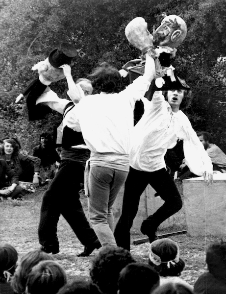 C'était sortir du temps d'exploitation du spectacle en cours, travailler sur un thème proposé par l'un de nous, sans mettre necessairement la totalité de la troupe à pied d'œuvre. Un petit groupe travaillait dans la journée à la fabrication de ce spectacle : discussion sur les thèmes, approche historique et politique des situations, des personnages et des événements, improvisations ou mises en place des canevas proposés... sens idéologique de nos choix.